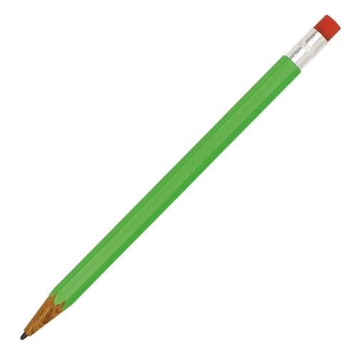 Механический карандаш сделан из прочного пластика, доступный в зелёном, голубом и чёрном цвете. При этом он стилизован под обычный карандаш, где кнопка замаскирована под ластик на конце изделия. Его длина не большая, и составляет 157 мм. Всё это позволяет использовать карандаш как компактный и полезный подарок для участников встреч и любых других мероприятий. Также на поверхность карандаша можно нанести фирменный логотип или изображение, которое может выполнять рекламную роль компании.