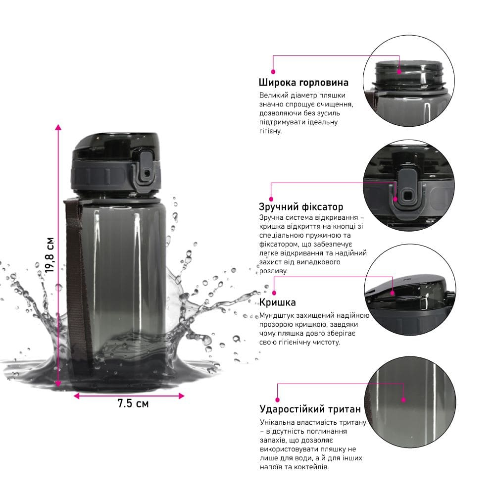 Бутылка для воды Line Art Paraná объемом 600 мл — удобное и современное решение для активных людей, корпоративного использования и рекламных кампаний. Модель изготовлена из прочного тритана (BPA-free), который не впитывает запахи и подходит для воды, напитков или коктейлей. Крышка оснащена кнопкой с фиксатором и пружиной, что предотвращает случайное открытие и защищает от протеканий. Пластиковый носик для питья закрывается откидной крышкой, что обеспечивает гигиеничность в спортзале, офисе или на улице. Боковые вставки на крышке позволяют легко открывать бутылку даже мокрыми руками. Широкое горлышко упрощает наполнение и чистку. Компактный размер и нейлоновый шнурок делают модель удобной для ношения в течение дня. Вес — всего 105 г, размеры 7.5 × 7.5 × 19.8 см. Бутылка поставляется в индивидуальной картонной коробке и подходит для нанесения методами тампопечати и цифровой УФ-печати.