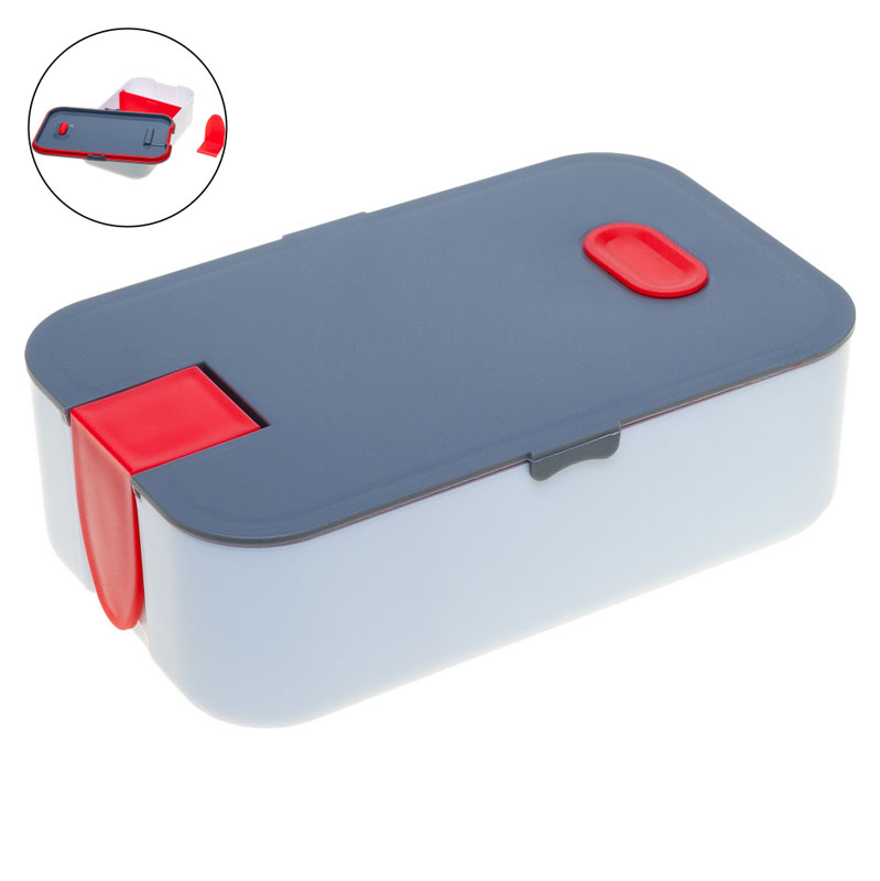 Компактный ланч-бокс объемом 850 мл. Модель изготовлена из качественного пищевого пластика. В наличии белый, синий, голубой, оранжевый, красный цвета. Ланч-бокс имеет передвижную перегородку, что позволяет брать с собой разные виды пищи. А специальный фиксатор можно использовать как подставку для телефона. Размеры изделия (мм): Ширина: 118 Высота: 63 Глубина: 190. Дополнительно вы имеете возможность заказать нанесение фирменного логотипа, надписи или изображения любой сложности и дизайна. Нанесение производится методом тампопечать. Бокс с корпоративной символикой станет отличным подарком для коллег, бизнес партнеров и клиентов вашей фирмы.