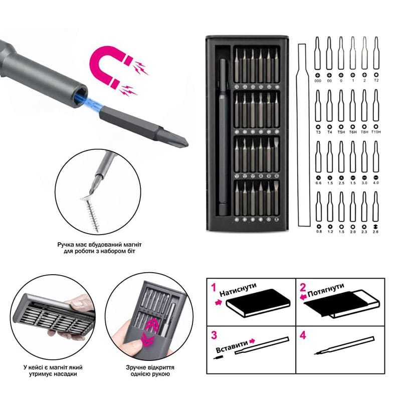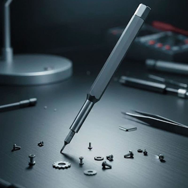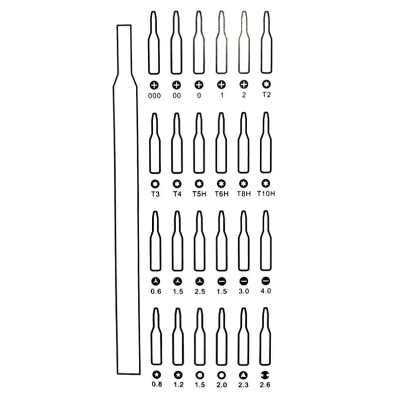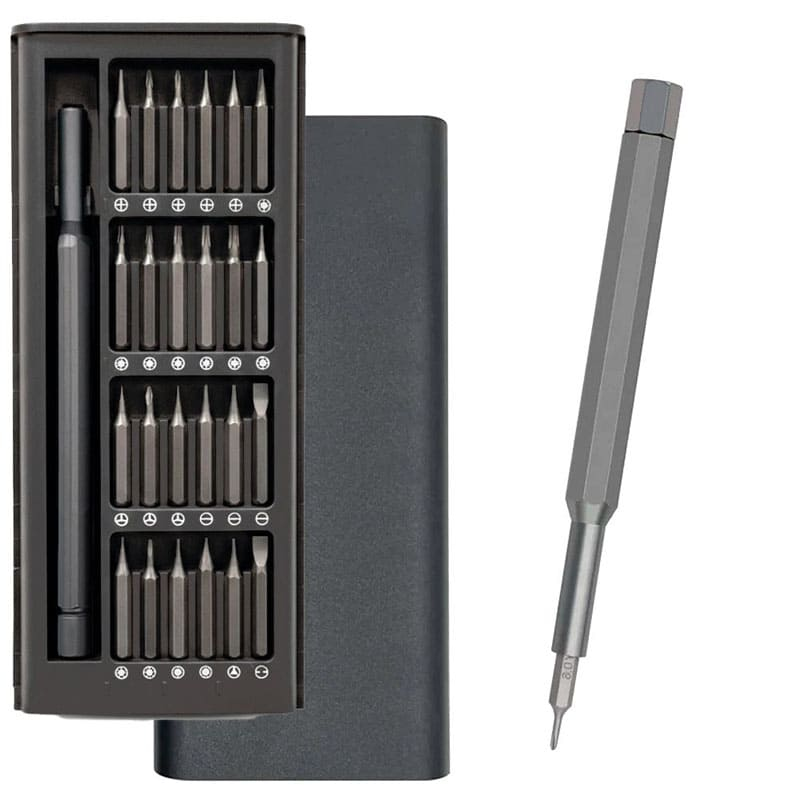 Прецизионная отвертка The General FixMate 25в1 — универсальный набор инструментов, предназначенный для точных работ с мелкими креплениями и элементами техники. Такой комплект идеально подходит для ремонта электроники, смартфонов, ноутбуков, бытовых приборов и другой мелкой техники. Набор включает эргономичную алюминиевую рукоятку и 24 сменные биты различных типов. Рукоятка выполнена в двухкомпонентной конструкции, удобно лежит в руке и оснащена вращающимся упором, который обеспечивает точный контроль усилия при работе. Встроенный магнит надежно удерживает насадки и облегчает их замену. Биты изготовлены из прочной хром-ванадиевой стали и сплава S2, что гарантирует высокую износостойкость и долговечность. В комплекте представлены наиболее популярные типы шлицев: прямые, крестовые, шестигранные, звездочки, квадратные, треугольные, торцевые, а также формы U и Y. Набор поставляется в компактном металлическом кейсе с пластиковой крышкой для удобного хранения и транспортировки. На поверхность кейса можно нанести логотип компании методом тампопечати, УФ-печати или шелкотрафаретной печати.