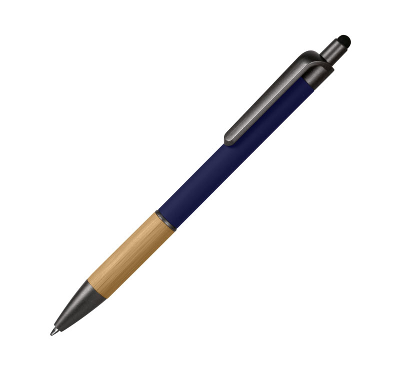 Ручка-стилус шариковая, корпус металлический с покрытием софт-тач, бамбуковая вставка, клип из пластика. Стержень с синими чернилами. Рекомендуемый метод нанесения – гравировка, УФ-печать. Материал: металл, пластик, силикон