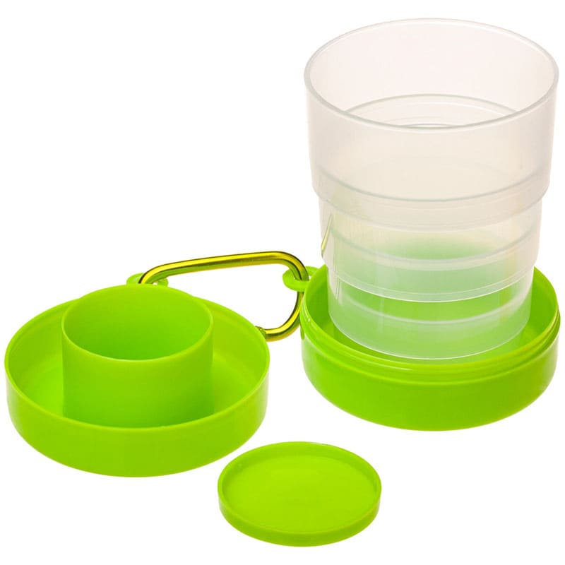Стакан изготовлен из ПЭТ-пластика, который отличается легкостью и прочностью. В сложенном состоянии он превращается в удобный футляр, который можно использовать как контейнер для таблеток, сахара или других мелочей.