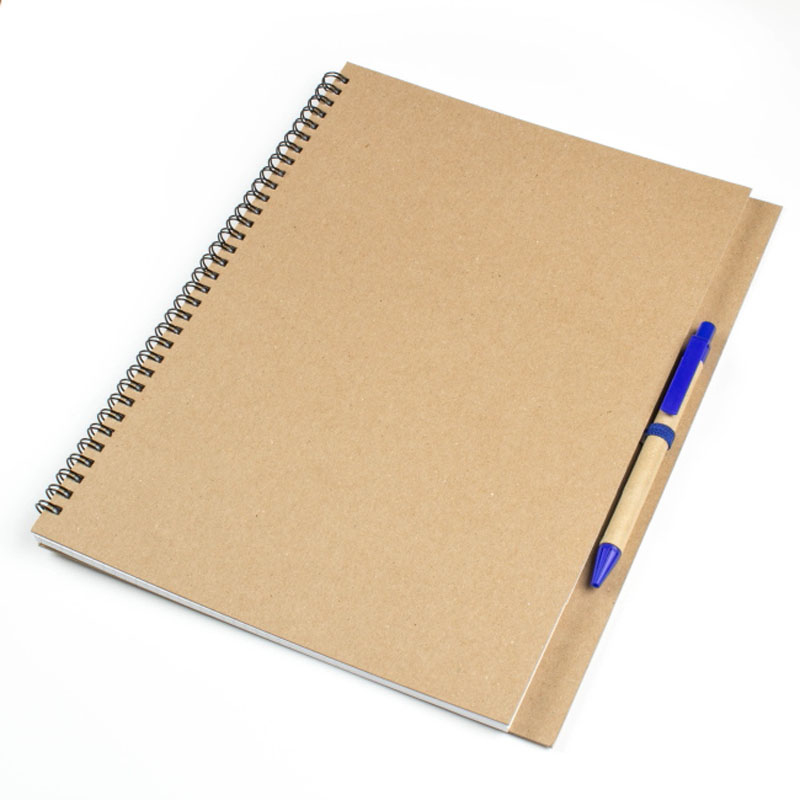 Блокнот А4 з ЕКО ручкою. Переплет виготовлений з картону, закріплений за допомогою пружини. Збоку за допомогою резинки доповнено еко ручкою. Ручка з пластиковими елементами в різних кольорах. Нанесення можливо методом ультрафіолетової друку або трафаретної друку.
