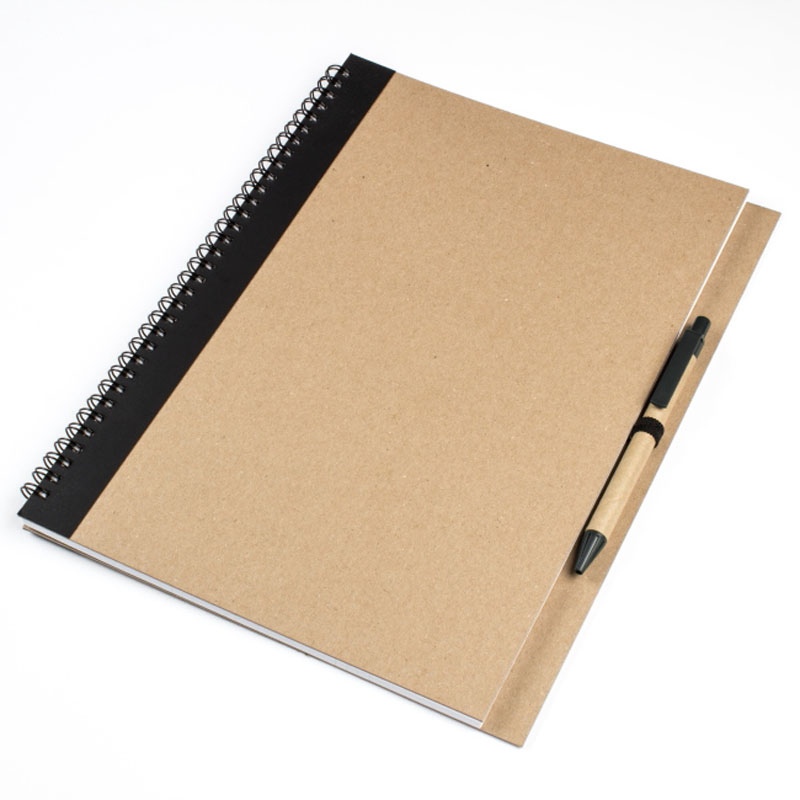 Блокнот A4 з ЕКО ручкою зі смугою у різних кольорах. Колір смуги на блокноті та колір пластикових елементів екоручки збігаються, створюючи таким чином комплект. Можливе нанесення зображення методом УФ-друку або трафаретного друку.