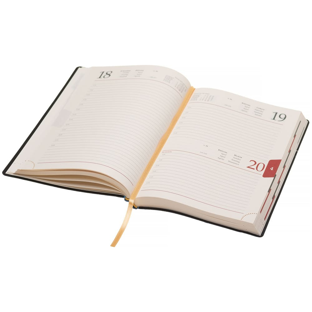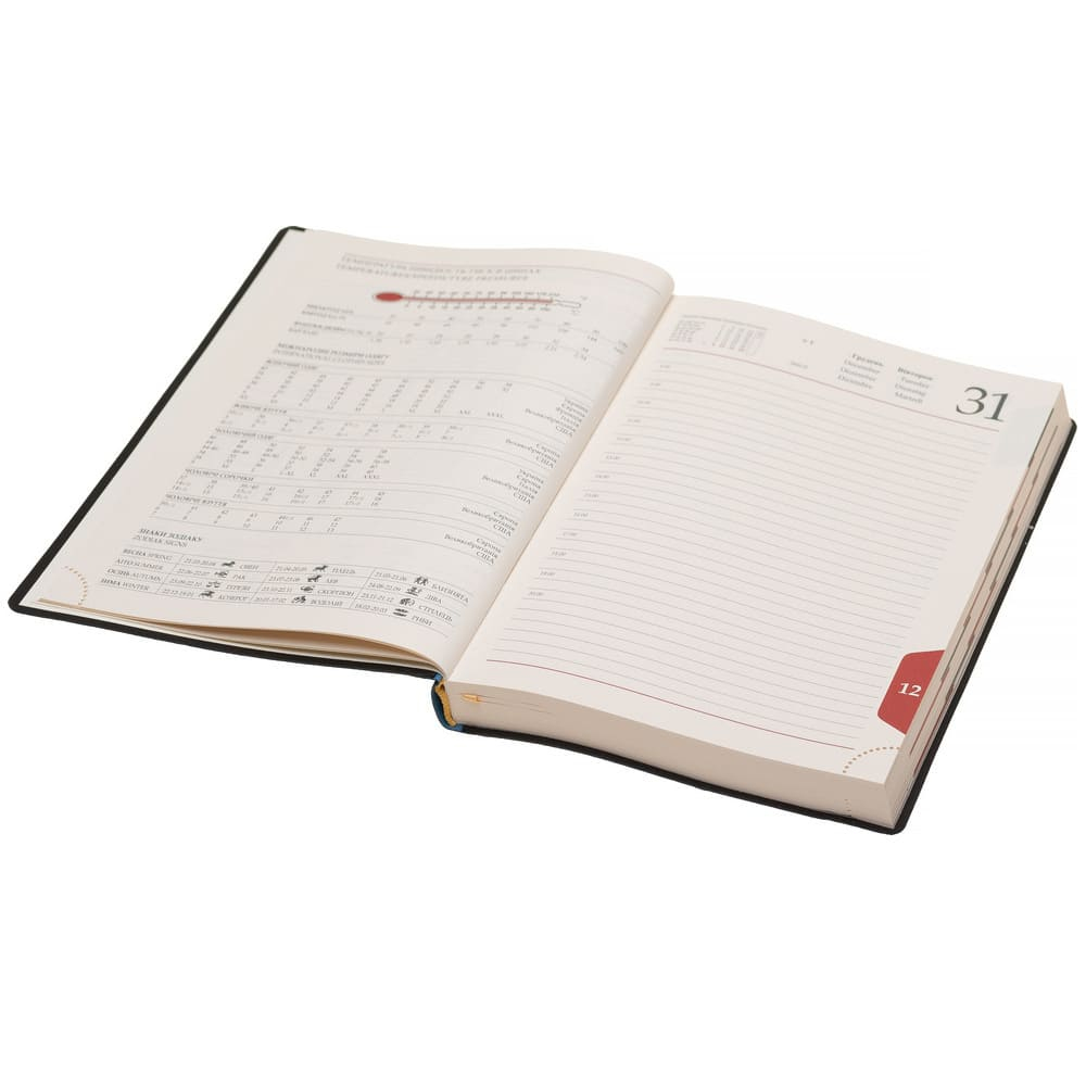 Щоденник допомагає налаштувати день так, щоб він приносив лише користь та конкретні результати. Завдяки цьому він популярний у бізнесменів та підприємців. При його виготовленні використовувався якісний шкірозамінник, кольорова палітра обкладинки доступна у великому асортименті. Усередині блокнота знаходяться кремові сторінки, які не викликають напругу в очах, та закладка, що забезпечує моментальним пошуком потрібного запису. Щоденник скріплюється резинкою-фіксатором. А за допомогою технології тиснення на поверхню виробу додається будь-який логотип, який підвищує популярність та репутацію компанії.