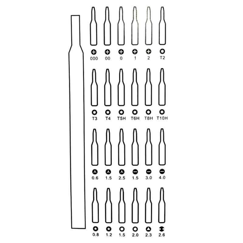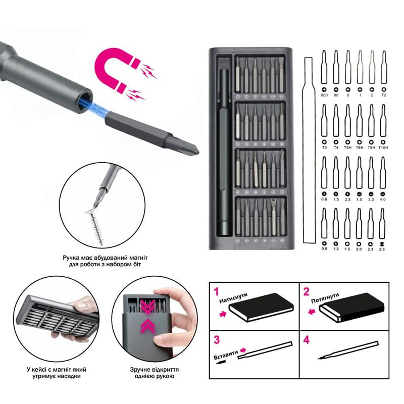 - 24 змінні біти для популярних типів шліців (прямі, хрестові, трикутні, квадратні, зірки, шестигранники, торцеві, форма U та Y)