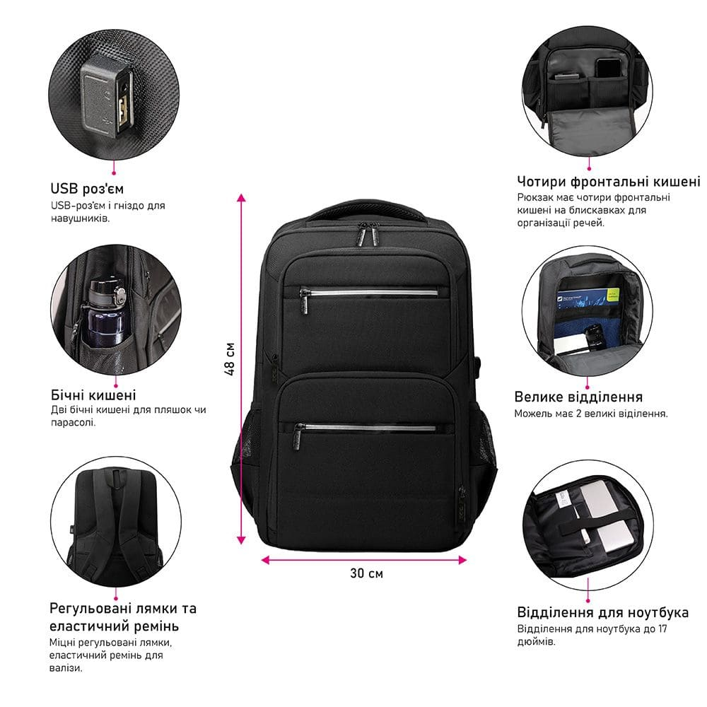 Рюкзак для ноутбука Nikibo Globe поєднує місткість, сучасний дизайн та практичність, роблячи його універсальним вибором для подорожей, навчання та роботи. Виготовлений із щільного водонепроникного поліестеру, він гарантує захист вмісту від дощу та пошкоджень. Об’єм 25 л дозволяє вмістити все необхідне: два головні відділення з органайзером, м’яка кишеня для ноутбука до 17 дюймів, чотири фронтальні кишені на блискавках та дві бічні для пляшки або парасольки. Продумані деталі, як-от USB-роз’єм, гніздо для навушників і ремінь для валізи, роблять використання максимально комфортним. Регульовані лямки забезпечують зручність навіть під час тривалого носіння. На поверхню рюкзака можна нанести корпоративний логотип за допомогою вишивки, трафаретного друку чи термоперенесення, що перетворює аксесуар на ефективний інструмент брендингу.