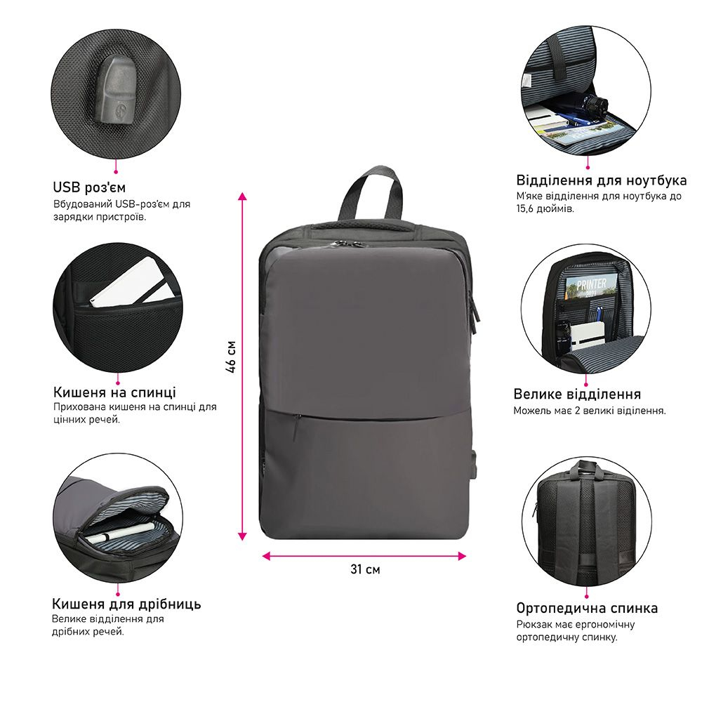 Бізнес-рюкзак Nikibo Pioneer — це поєднання сучасного дизайну, практичності та комфорту. Завдяки ортопедичній спинці й ергономічним лямкам він зручний навіть під час тривалого носіння. Виготовлений із міцної тканини Оксфорд та поліестеру, рюкзак відзначається стійкістю до зношування й захищає речі від вологи. Модель має два основні відділення, м’яку кишеню для ноутбука до 15,6 дюйма та органайзер для аксесуарів. Спереду розташована кишеня на блискавці, а на спинці — прихована кишеня для цінних речей. Об’єм становить 21 л, вага — лише 830 г. Для додаткової зручності передбачено вбудований USB-роз’єм, що дозволяє заряджати ґаджети під час подорожей чи роботи. Стильний вигляд рюкзака підкреслює його універсальність — він підходить як для ділових зустрічей, так і для навчання. Нанесення логотипа можливе методами вишивки, шовко друку або термоперенесення, що робить цей рюкзак відмінним корпоративним подарунком.
