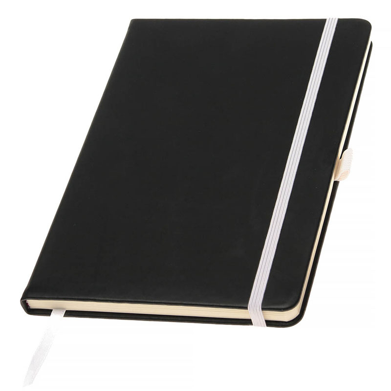 Нотатник формату А5 є зручним інструментом, який дозволяє тримати важливу інформацію, номери телефонів, адреси, ідеї та нотатки у надійному місці. Він зроблений з поліуретану чорного забарвлення, має закруглені кути, закладку для сторінок та яскраву гумку-фіксатор, яка може бути білого, зеленого, блакитного, синього, оранжевого, жовтого та червоного кольорів. Область для записів, 96 сторінок, розмічена у лінію та має приємне кремове оформлення. Також за допомогою лазерного гравіювання, УФ-друку або шовкотрафарету можна додати логотип компанії на поверхню виробу в колір гумки. Завдяки цьому блокнот можна використовувати як невеликий презент клієнтам, як ефективний рекламний інструмент із символікою компанії. Блокнот не залежить від електроенергії, стійкий до падінь, і набагато дешевше за будь-який девайс.