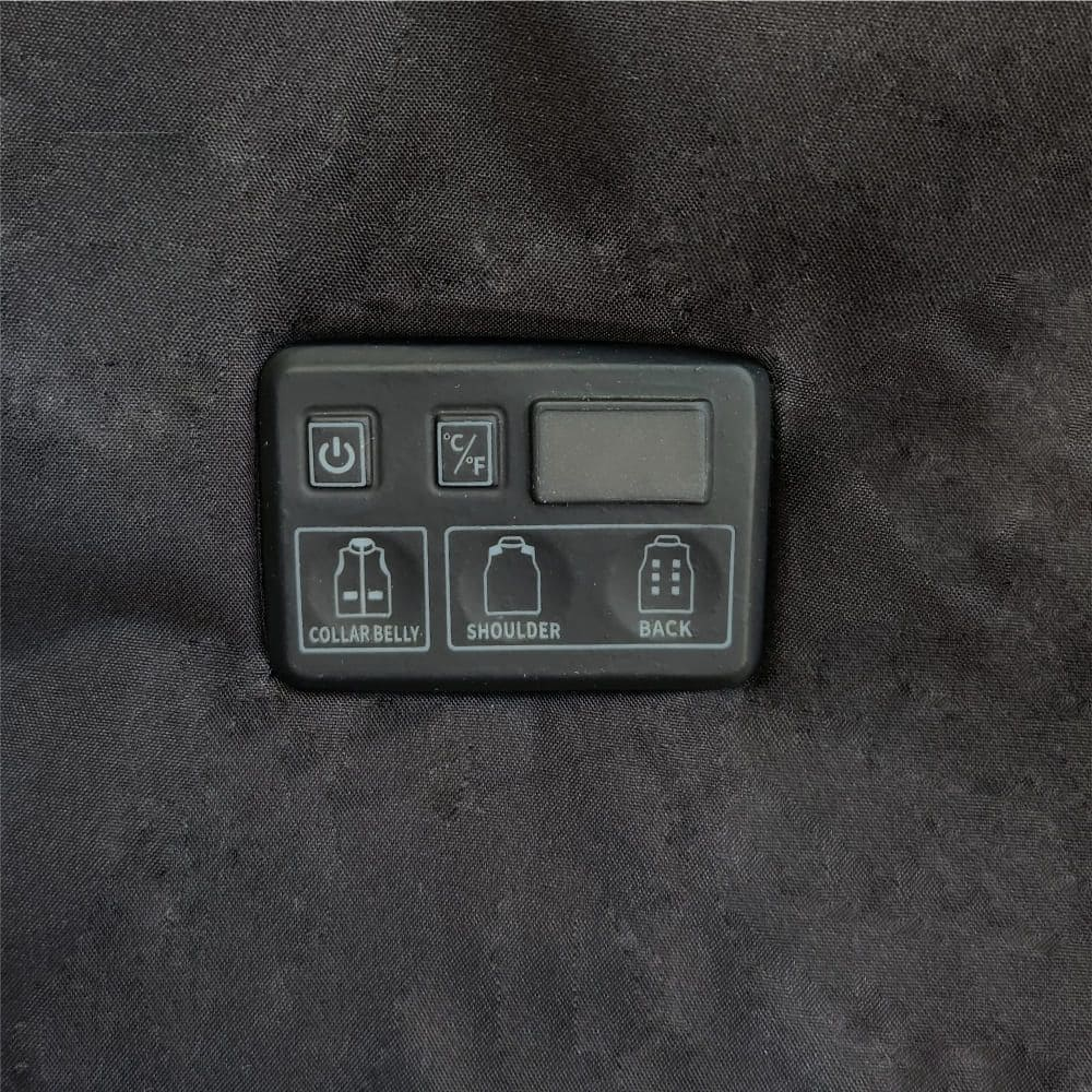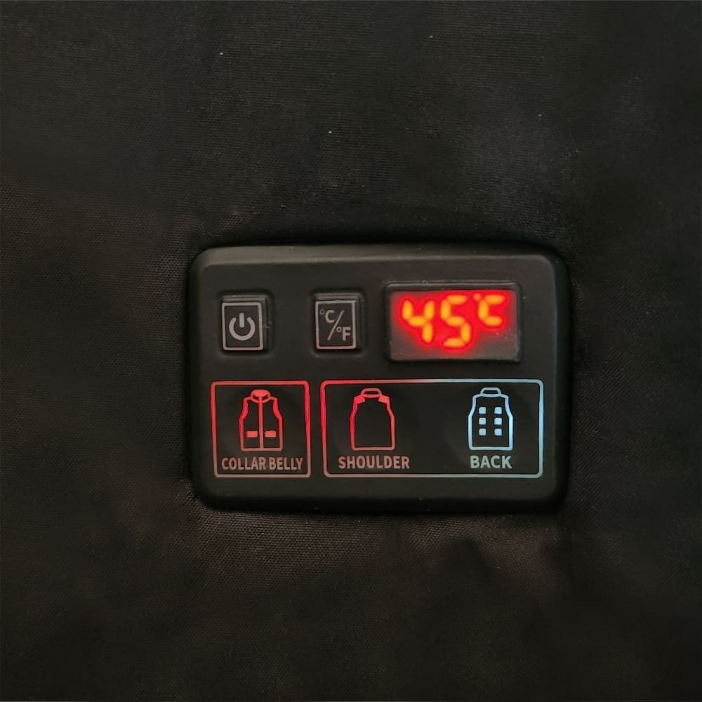 Нагрівальні елементи працюють від зовнішнього павербанка (від 10000 mAh, 5 В), підключення здійснюється через USB-кабель у внутрішній кишені. Плоский сенсорний пульт на грудях дозволяє обрати один із трьох температурних режимів у межах 35–55 °C, показники відображаються на дисплеї. Передбачений захист від перегріву та короткого замикання.